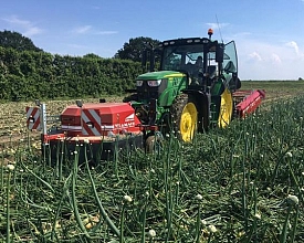 Het oogsten van de uien zijn een aantal combinaties met loofklapper voorop en rooier achterop, zowel klapper als rooier zijn voorzien van automatische diepteregeling.